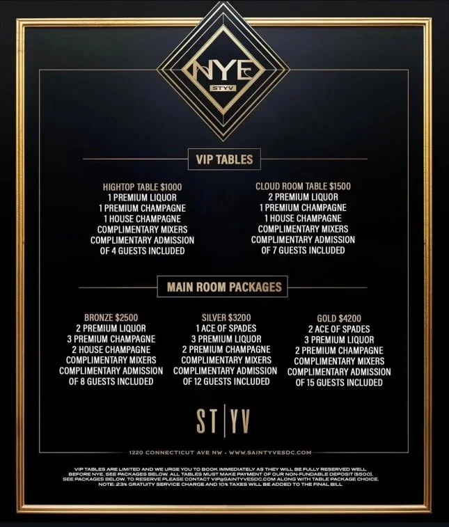 Ring in the New Year at Saint Yves Nightclub in DC! Join us on December 31st from 9 PM to 3 AM for an unforgettable night filled with premium vibes and celebration.